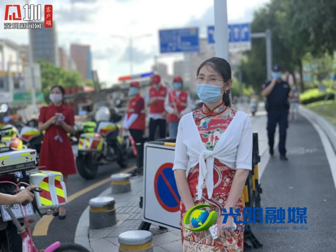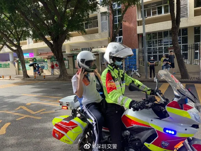 7月7日7時59分許,@深圳福田交警接報稱有家長需從寶安大道轉北環方向接送至福田區紅嶺中學,為孩子送高考證件。鐵騎立即前往北環大道安托山路段待命,8時16分接到該家長車輛,8時21分順利送達學校。