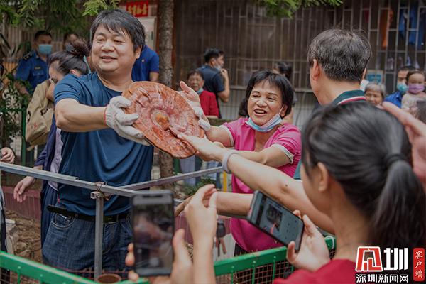 在眾人的見證下,兩朵靈芝從刀刃中落下,圍觀的市民面露豐收的喜悅,紛紛伸手觸摸以沾福氣,還有拉著襁褓嬰兒的手去摸靈芝的,更有市民高呼“摸靈芝,沾福氣”。