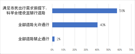 據(jù)調(diào)查,約58%的市民支持在滿足市民出行需求前提下,科學(xué)合理設(shè)置禁行道路;40%的市民認為應(yīng)該全部道路允許電動二輪車通行;僅2%的市民認為電動二輪車應(yīng)當在全部道路禁止通行。