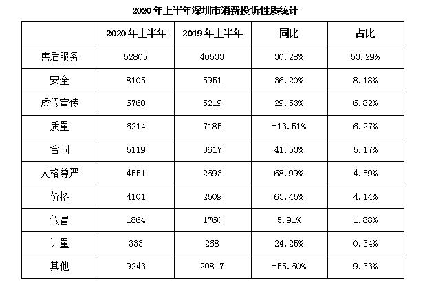 根據《情況分析》,2020年上半年,深圳市消委會收到的消費投訴問題性質最多的為售后服務,共52805宗,占比53.29%;其次為安全問題,共8105宗,占比8.18%;第三是虛假宣傳問題,共6760宗,占比6.82%。有關人格尊嚴問題、價格問題的投訴量與2019年相比均同比上漲超過60%;有關質量問題的投訴量與2019年相比均有所下降。