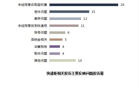 2020年上半年,深圳市消委會共收到93宗有關快遞柜的投訴,其中,深圳市豐巢科技有限公司(以下簡稱“豐巢”)相關投訴76宗,占快遞柜總投訴量的81.72%。主要反映未經(jīng)同意收取超時費問題、丟件問題、寄存問題、未經(jīng)同意將快遞放到快遞柜等問題。