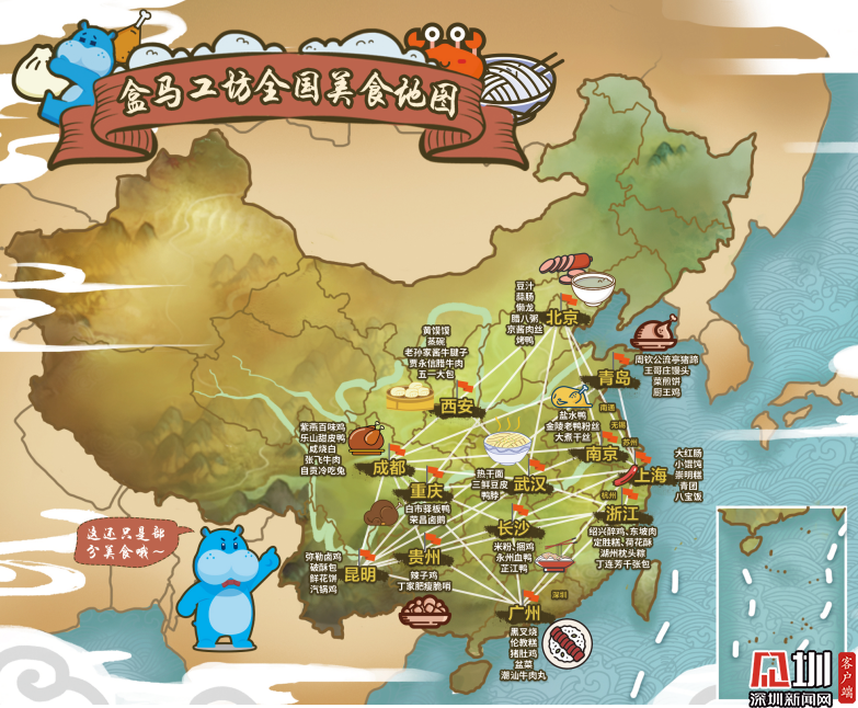 目前,盒馬工坊已覆蓋全國23個城市,不僅在每個城市做到因地制宜、本地本味,還把很多地方美食帶到了各地,形成了一張流動的全國美食版圖。