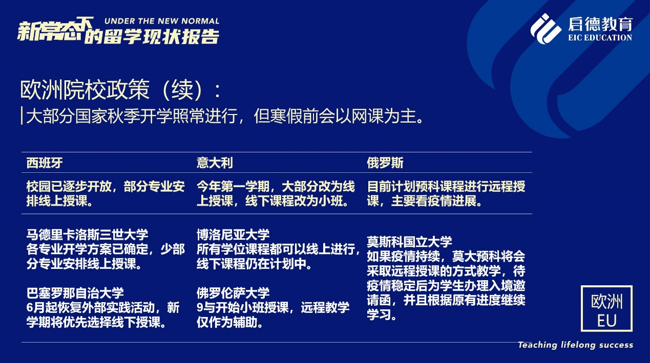 《報告》也梳理了近期各主要留學目的國及院校針對國際學生出臺的各類政策。據(jù)啟德留學英愛項目總監(jiān)孫波介紹,國內(nèi)英國簽證中心已經(jīng)重新開放。準備赴英讀研的學生,部分大學明確表示秋季可以正常開學,大課將會采用線上授課的方式,小班授課線下進行;還有部分大學向?qū)W生提供更加靈活的入讀方案,學生可以選擇9月入讀或者1月入讀。此外,從2021年開始,在英國完成博士學位的國際學生將會獲得3年有效期的 PSW工作簽證,本科生和碩士生可以獲得2年有效期的 PSW工作簽證。