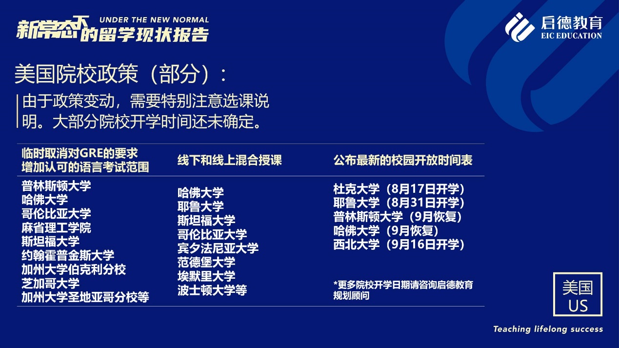 美國方面,據(jù)啟德留學美高本項目總監(jiān)孫靜介紹,大部分美國高校已經(jīng)為學生提供了純線上課程、在中國高校(如清華大學、北京大學、中國海洋大學等)開課或延遲到春季甚至明年秋季入學的方案,對于現(xiàn)階段拿不到F-1簽證入境美國的學生,可以按照原計劃繼續(xù)學習。對于已有F-1簽證、已經(jīng)回國或離開美國的同學,可以與學校的國際學生辦公室咨詢,確定自己是否可以在國內(nèi)以線上上課的方式完成學位順利畢業(yè)。
