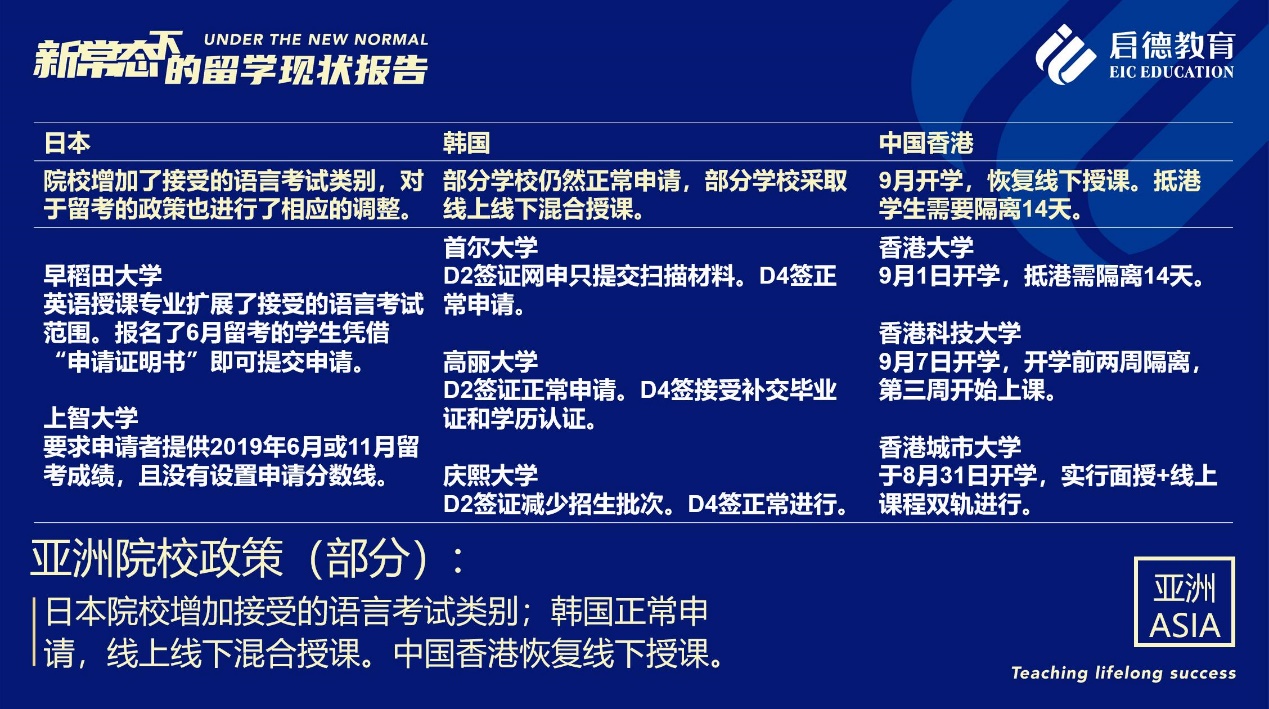 日本2020年入學學生的在留資格均已下發(fā),但針對留學生的入境政策目前還未最終公布。新加坡公立院校的新生留學簽證已正常批復;私立院校的新生可以提交申請,但暫緩受理。據(jù)啟德留學亞洲項目總監(jiān)李陽介紹,中國香港、中國澳門地區(qū)秋季各院校均計劃如期復課,以網(wǎng)課+面授的形式完成第一學期課程。