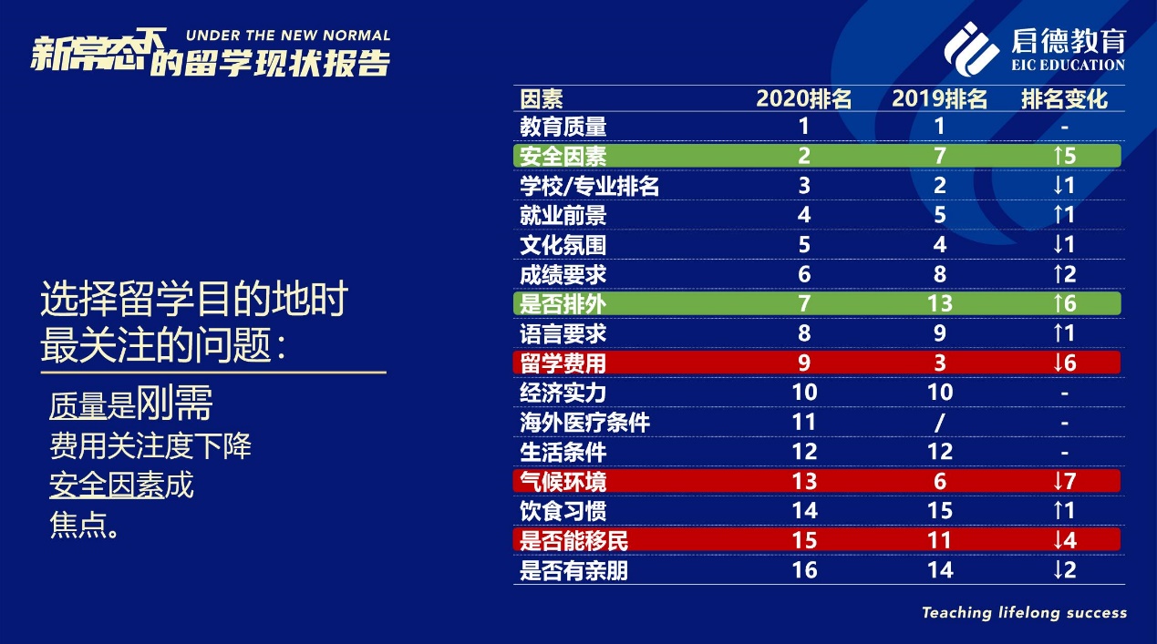 “安全因素”成為2020年中國學生在選擇留學目的地時最為關(guān)心的因素之一(排名第二),僅次于“教育質(zhì)量”(排名第一)。同時,“是否排外”的排名也從2019年的第13位升至第7位。此外,在意向留學生希望就讀的學歷層次方面,2020年計劃攻讀研究生及以上學位的學生占比78.45 %,比2019年上升了0.75 %;攻讀本科(19.46 %)比2019年上升了0.96 %;而2020年計劃攻讀中學的比例(1.6%)有所下滑,比2019年下降了2.2%。