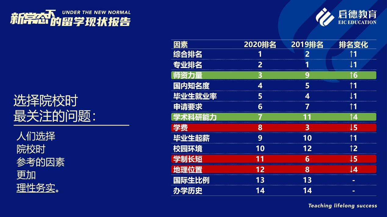 值得關(guān)注的是,在“選擇院校時最關(guān)注的問題”中,“師資力量”的受關(guān)注度從2019年的第9位上升為第3位,僅次于“綜合排名”與“專業(yè)排名”,“國內(nèi)知名度”與“畢業(yè)生就業(yè)率”分居第4位與第5位,“學術(shù)科研能力”從2019年的第11位上升至第7位,而“學費”、“學制長短”與“地理位置”等因素分別下滑至第8位、第11位與第12位??梢娫诰蜆I(yè)形勢尤其嚴峻的2020年,意向留學生對教育質(zhì)量的剛性需求已進一步上升,以期在未來的就業(yè)市場獲得更具戰(zhàn)略優(yōu)勢的國際競爭力。