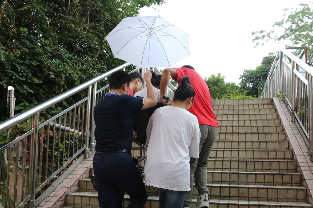 東升學(xué)校考點(diǎn)有一位行動不便的考生,學(xué)校派三名工作人員提前護(hù)送考生到考場。 (記者李麗、周紅聲)