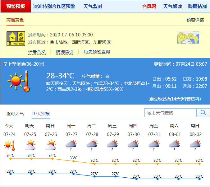見圳客戶端·深圳新聞網2020年7月24日訊(見圳客戶端、深圳新聞網記者 陳婕 鄭曉鵬)老天熱“晴”不斷,今明兩天悶熱加劇。24日晴天間多云,天氣悶熱;氣溫28-34℃,中北部再高1-2℃;偏南風3級;濕度55%-90%。25日晴天間多云,最高氣溫34-35℃,中北部可達36-37℃。26日持續晴熱,局地有短時(雷)陣雨;27-29日多云,有短時(雷)陣雨;30日有陣雨或雷陣雨。