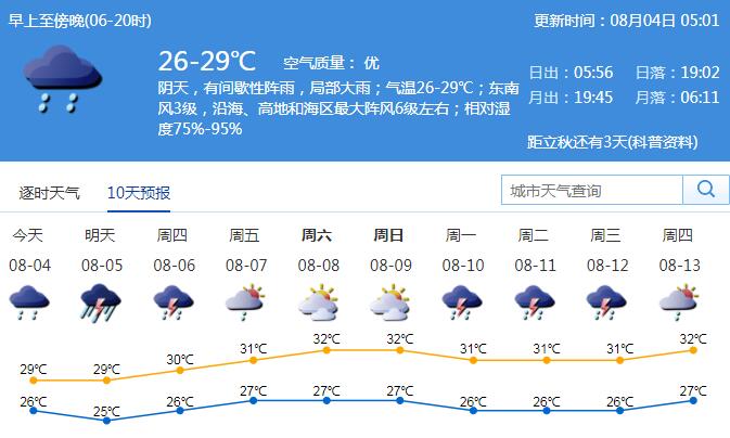 見圳客戶端·深圳新聞網2020年8月4日訊 今年第3號臺風“森拉克”(熱帶風暴級)已于8月2日14時40分前后在越南清化市登陸,并逐漸減弱消失。第4號臺風“黑格比”(熱帶風暴級)趨向華東沿海。據市氣象臺消息,4日有間歇性陣雨,局部大雨到暴雨,氣溫25-29℃;4日夜間起雨勢加強,5日有暴雨局部大暴雨,陣風6-7級;6日白天起降水逐漸減弱,7-9日漸趨悶熱。