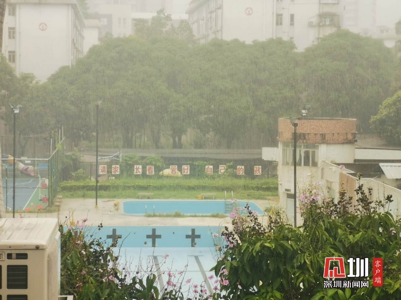 大雨如注,福田區蓮花北社區的泳池蒙上一層水霧,看不清楚。(記者張玲 攝)