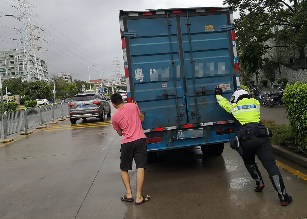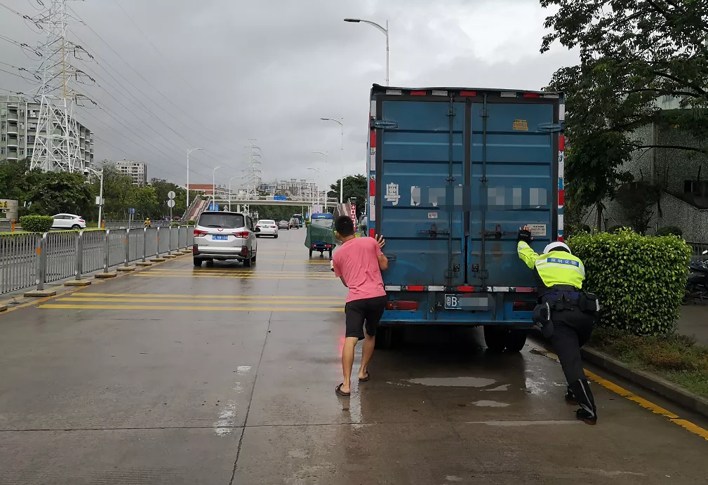 8月5日9時30分許,深圳交警鐵騎隊員雨中巡邏至新沙路時,發現德昌電機廠路段有一輛貨車停在路上,導致交通擁堵。貨車司機在旁,鐵騎上前詢問情況后得知貨車故障,司機被迫將車停在路邊。