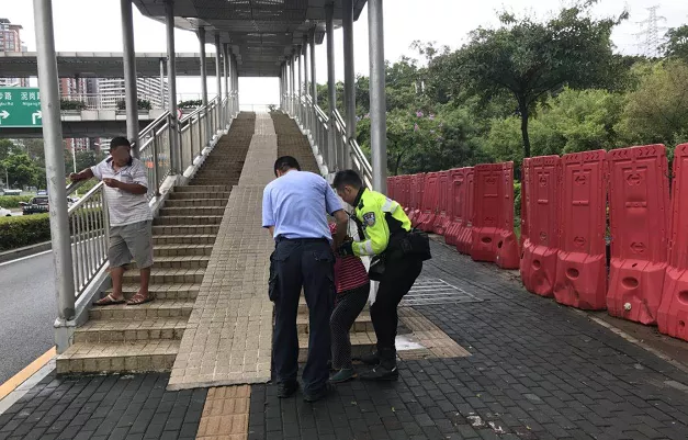 8月5日上午,深圳交警鐵騎巡邏至北環大道西往東方向珍珠嶺天橋路段輔道轉主道路口時,發現一位老太太躺在路中間。