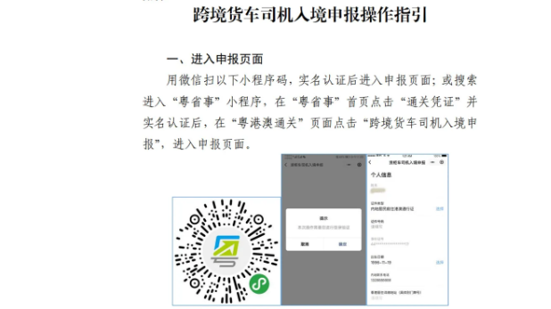 一、跨境司機入境前應在“粵省事”微信小程序(粵省事—粵康碼—粵港澳通關—跨境貨車司機入境申報)中準確申報運輸作業(yè)任務相關信息,包括作業(yè)目的地詳細信息(工廠/倉庫名稱及所在街道)、內地手機號碼及相關個人信息,相關操作指引詳見附件。入境后所申報手機號碼將會接收提醒短信。未安裝GPS定位系統(tǒng)和ETC電子不停車收費系統(tǒng)的入境貨車,需按照相關部門安排前往指定場地免費安裝GPS和ETC系統(tǒng)。