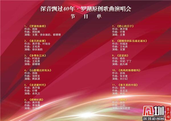 歌曲創作是深圳市羅湖區的強項,中國大陸的流行歌曲即由此發端。四十年來,《春天的故事》、《走進新時代》、《跟隨你的隊伍越走越長》、《山歌唱出好兆頭》等一大批膾炙人口的羅湖原創歌曲,經由影視、廣播等媒體傳播,風靡大江南北,反映了時代劇變,表達了人民心聲。此次演唱會,精選了其中的12首歌曲,由熊家源、余鳳蘭、劉小幻、范媛媛、楊樂、支慧、趙久峰、都園園、王景、徐余瀚韻等數位深圳歌唱家傾情演繹,其中既有創作于上世紀的歌曲,也有近年來新創作的歌曲,堪稱一場聲樂盛宴。