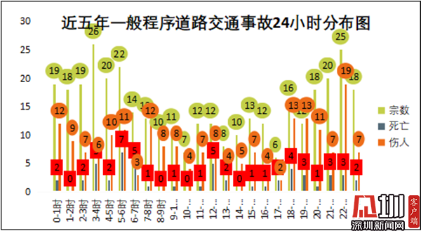 羅湖交警通過研判分析近5年的事故,發現凌晨5時至7時,是亡人事故的高發的時段之一;凌晨3至6時、夜間21至22時是一般程序道路交通事故高發時段,分別發生事故68宗和45宗、占總數的18.84%和12.47%。其中凌晨的5時至7時是亡人事故的高發時段之一,占總亡人事故的22.64%。