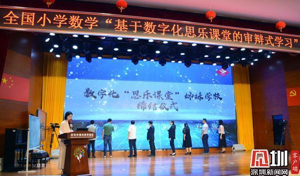 開幕式上,深圳市錦田小學與西安東城一小、江西贛州市黃金實驗小學;深圳市布心小學、江西省贛州市厚德路小學締結數字化“思樂課堂”姊妹學校。深圳市羅湖區教科院院長郭玉竹與羅湖區中學地理教研員數字化思樂課堂項目負責人劉春明為締結學校授牌。緊接著,東昌、錦田、水田、蓮南、布心、螺嶺6所數字化“思樂課堂”實驗小學數學科組代表進行經驗分享。