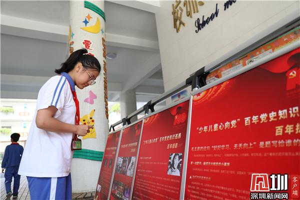 記者首先來到羅湖區翠北實驗小學,主題展板位于學校一樓大廳,有很多同學會在下課的時間來這里觀看學習。學校社工邱女士參與設計本次活動的時候想到,黨史對孩子們比較遙遠,想要讓孩子們深入學習就不能用大人的方式死板教條的灌輸,要調動孩子們的積極性,讓孩子們自己做“小講師”。