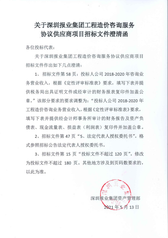 關于深圳報業集團工程造價資訊服務協議供應商項目招標文件澄清函