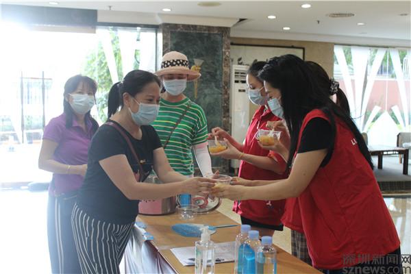 這兩鍋糖水可不一般,是居民賴秀文自掏腰包,買來蓮子、銀耳、木瓜,小火熬制了2個小時。當天下午,值守在老圍花園C2出入口的義工楊文洪,是一位退伍軍人,前不久剛加入老圍社區義工隊,聽到疫情防控的召喚,利用休息時間來到小區出入口執勤,協助居民進行疫苗接種預約登記,忙得滿頭大汗也顧不上擦。他接過糖水,一口喝完,呵呵笑著說,“來得正是時候。”喝完,又忙著為進門的居民驗健康碼。