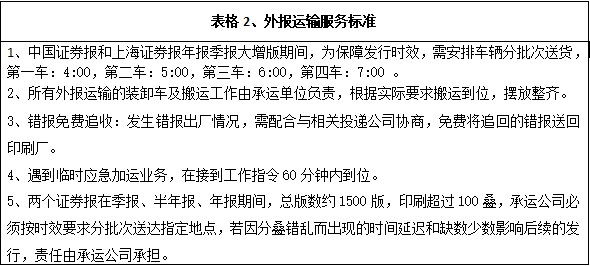 深圳報業集團印務有限公司現承印外報主要有上海證券報、中國證券報、羊城晚報等重要報刊,根據各報刊的具體要求,安全、準時、保質、保量地運送每天生產發行數量的各報刊到指定地點或客戶手中,具體運輸發行內容和標準詳見下面表格。