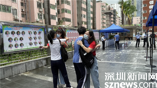 老師在考場入口為考生送上暖心擁抱,希望大家都能超常發揮,考出好成績。
