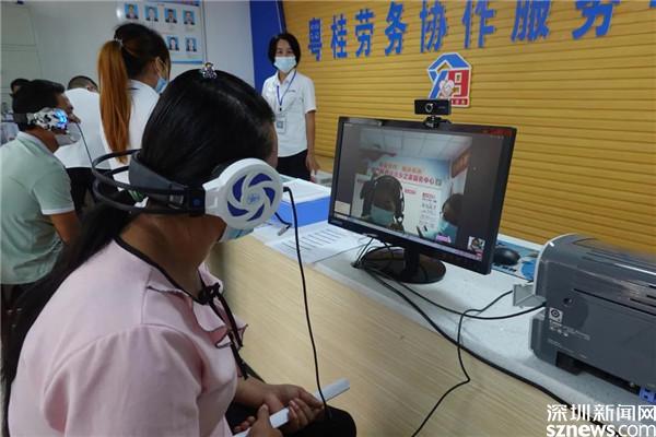 在粵桂勞務協(xié)作服務中心,一場兩地遠程視頻招聘會正在舉行,不少百姓拿著心儀的崗位介紹在等候面試。服務中心前臺放置著四臺電腦,參加面試的人坐在電腦前連接視頻,視頻的另一端,是來自羅湖區(qū)的企業(yè)。這樣的視頻招聘會,定期在服務中心舉行。