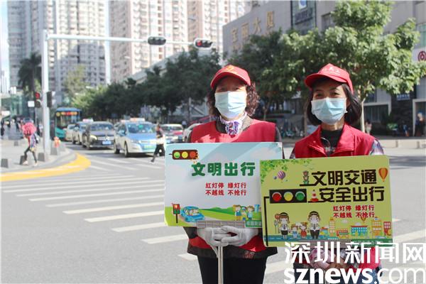 據了解,老圍社區黨委將創建文明城市納入常態化工作之中,黨群服務中心的社工迅速組建了創文小分隊,長期堅守在紅寶路和寶安南路的十字路口勸導交通。這是一條繁忙的十字路口,前有桂園小學,后有盒馬超市,左邊是京基100寫字樓,右邊是地王大廈,周圍都是居民住宅小區,每天車水馬龍,行人如織。尤其上班早高峰,路口更是熙來攘往川流不息。志愿者們守在路口,全神貫注,時刻留意那些準備闖紅燈的騎行者,不走斑馬線的行人,勸導他們遵守交通規則,保障正常的交通秩序。