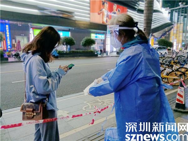記者了解到,周先珍上個(gè)月才搬到老圍社區(qū)名仕閣小區(qū),成為老圍人還不到一個(gè)月,被社工在入戶探訪時(shí)發(fā)現(xiàn),把她拉入居民群。她在居民群里看到社區(qū)緊急招募志愿者,立刻報(bào)了名,不到8點(diǎn)就到了人民銀行門口臨時(shí)檢測點(diǎn),做到9點(diǎn)半,人民銀行檢測點(diǎn)撤了以后,聽說禧程酒店臨時(shí)檢測點(diǎn)需要人,她趕到禧程酒店,一來就把守入口,引導(dǎo)市民出示健康碼。原本做到10點(diǎn)就可以下崗了,但她看到不斷有市民前來檢測,就主動(dòng)留下來。