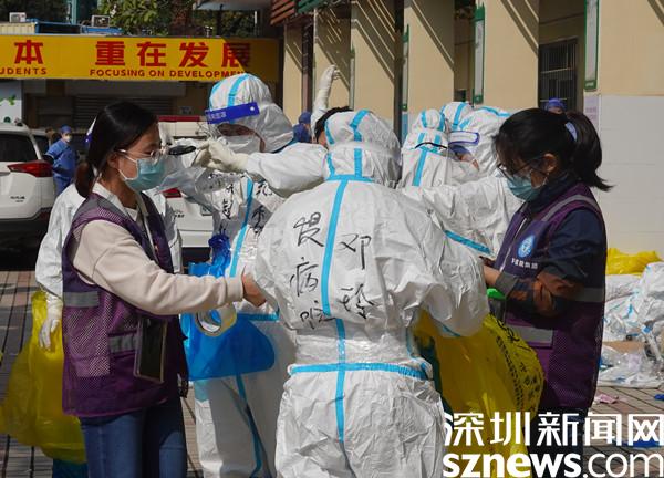 臘八節(jié)剛過,深圳帶著些許涼意,卻也是艷陽高照。“同志們,相互檢查一下手腕腳腕有沒有貼好!穿戴整齊后準備集結出發(fā)啦!”在封控區(qū)外圍的醫(yī)護人員整備區(qū),一群身穿防護服、全副“武”裝的工作人員整裝待發(fā),兩人一組,目光堅定,向著封控區(qū)的入口走去。