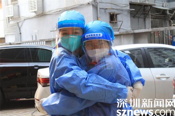1月11日,深圳突然降溫,風大天冷。北風呼嘯中,羅湖區桂園街道老圍社區禧程酒店的臨時檢測點帳篷差點被掀翻。寒風刺骨,社區工作人員和志愿者有條不紊地引導市民有序采樣。工作人員在“風口浪尖”上站得久了,被吹得全身透涼,手指頭都冷僵了。瞬間,兩名志愿者緊緊擁抱在一起,相互取暖,以示鼓勵。隨后,又立刻回到各自崗位,投入緊張的工作中。