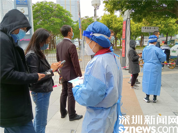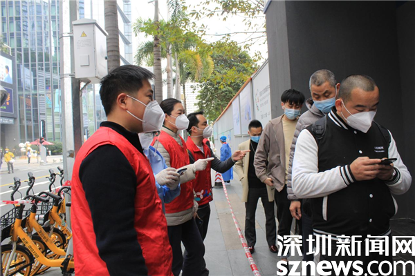 1月14日,深圳市京基智農時代股份有限公司總部黨支部黨委副書記張玲帶領5位黨員,火速來到禧程酒店臨時檢測點,經過簡短的培訓,他們集體上崗,各就其位。有的維持秩序,有的在外圍協助查驗綠碼,有的協助出示粵酸碼。黃子亮和彭乾偉穿上防護服,現學現做,使用自己的手機為前來采用的市民掃描粵酸碼。他們都是青壯年,雖然這是關鍵崗位,但他們一學就會,很快上手。十人一管,掃碼上傳,有條不紊,忙而不亂。