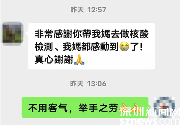 聽說深圳疫情嚴峻,李曉萍已經幾天沒有出門,想去做核酸檢測,又不會操作。她在香港的兒子也十分擔憂,卻無能為力。劉珍蓮主動提出陪老人去做核酸檢測,老人很開心,跟著劉珍蓮來到核酸檢測點,劉珍蓮幫她實名驗證,幫她調出粵核酸碼,她采樣時,劉珍蓮在一旁守候。此情此景讓老人激動不已,就出現了開頭的一幕。
