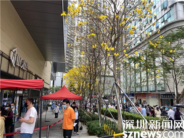 在國速中心廣場,黃花鈴木開得正好,藍天白云下是有序的核酸檢測隊伍,“大白”和“小藍”們正忙碌不停。據悉,這是桂園街道所屬的松園社區的一個核酸檢測點,地處于商業旺區附近,人口較多,所以核酸檢測隊伍也相對其他核酸檢測點長。羅湖區政協委員、深圳市國速房地產開發有限公司董事長黃少兵表示,這個核酸檢測點從1月初就設立了,“由于國速中心廣場較寬敞,滿足了通風和人流需求。”