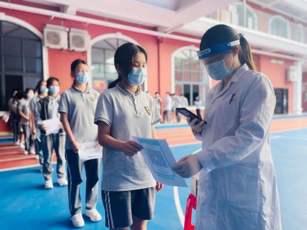 進入闊別已久的校園,興奮和激動的心情溢于言表,提前兩天入校的初三年級學生做出了表率:用餐隊伍一米距,透明隔斷搭建的用餐區明亮又溫馨;課間時間在班主任的帶領下,大家排隊測核酸,安靜、有序的隊伍讓“大白”對學生點贊。少年已歸,向陽而生;不忘初心,逐夢而行。這個夏天,老師帶領著學生們一邊防疫,一邊學習,合力同行,一起向未來!
