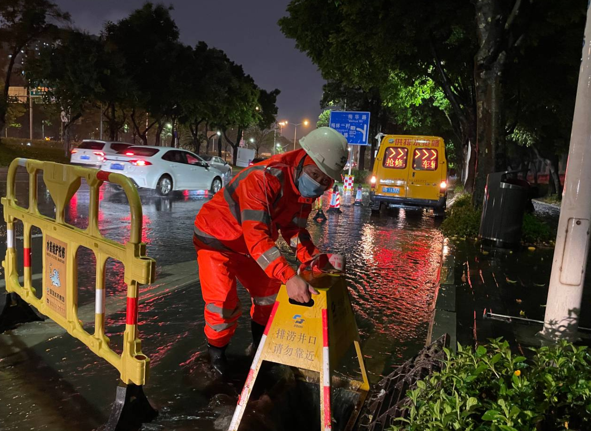 深圳環水集團福田分公司員工堅守在北環立交梅秀路口易淹點,打開雨水篦子加速排水。(深圳新聞網記者 潘潤華 通訊員 陶柳)