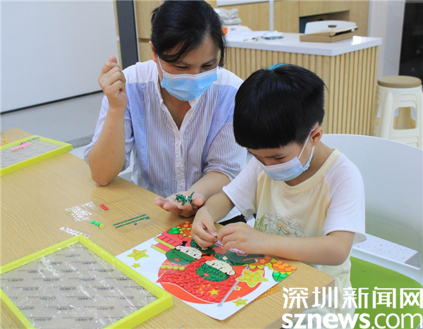 最后一個來到的鄭權桸小朋友屬于“空降”,因為他沒報上名。招募時,15個名額很快就報滿了。但是鄭權桸很想參加這個活動,媽媽就帶著他來試試,現場社工也很歡迎他的加入。鄭權桸小朋友全神貫注投入到畫作中,把每個紐扣都放在最佳位置,直到把全部紐扣貼完。他是最后一個來,也是最后一個走的。