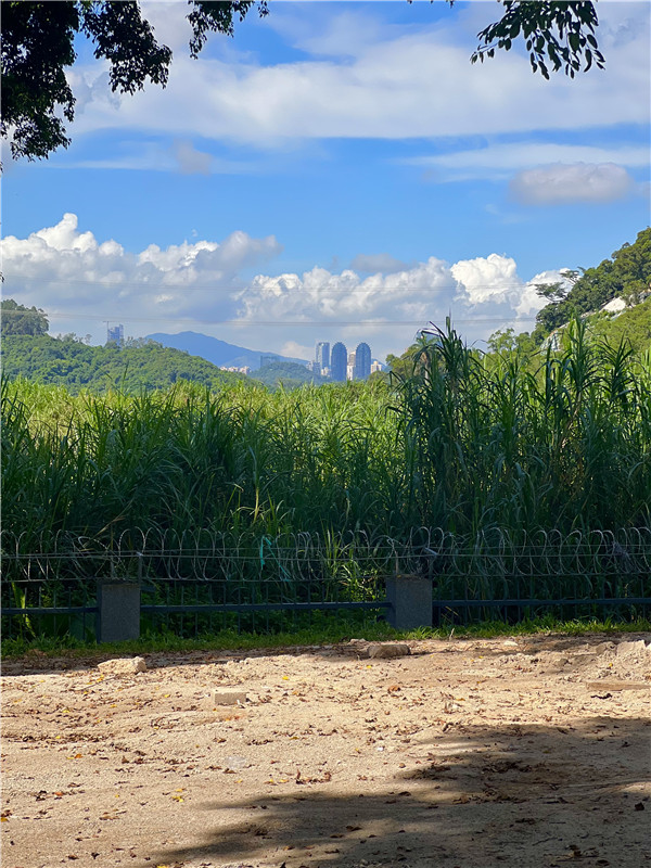 陽光炙烤著大地,綠樹環繞成蔭,近處是生機盎然的灌木叢,遠處是一派城市光景,別有趣味。
