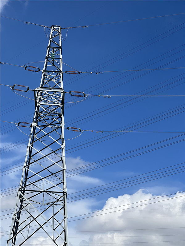 有序交錯的電線桿,在藍天白云的映襯下,顯現出縱橫交錯的秩序美。