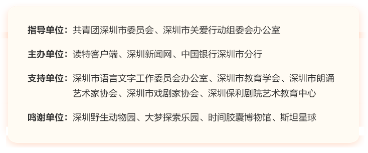 為助力建設良好的青少年閱讀環境,激發學生閱讀興趣,倡導親子閱讀,共建和諧家庭關系。2021年,“誰是故事大王·第五季”在共青團深圳市委員會、深圳市關愛行動組委會辦公室的指導下再出發。更長的活動周期,更豐富的參與形式,更專業的賽制,等你來解鎖與挑戰!讓閱讀成為最動人的風景,讓故事的魅力感動深圳。說明:所有參賽者報名成功后,均承認并允許主辦方將個人參加本次活動的照片或視頻相關資料刊發在各類媒體雜志報紙上,用于活動宣傳。