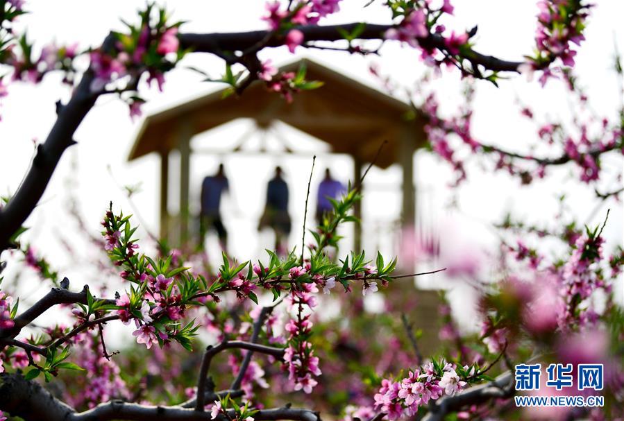 4月19日,游客在河北廊坊安次區葛漁城鎮萬畝桃園游玩。