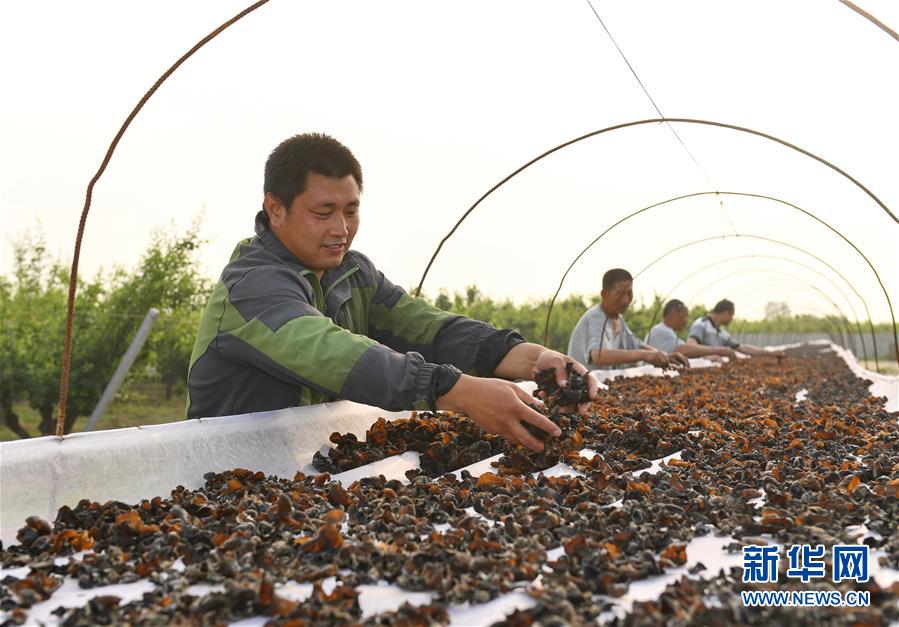 5月20日,河北省辛集市田家莊鄉東張口村農民在晾曬采收的木耳。