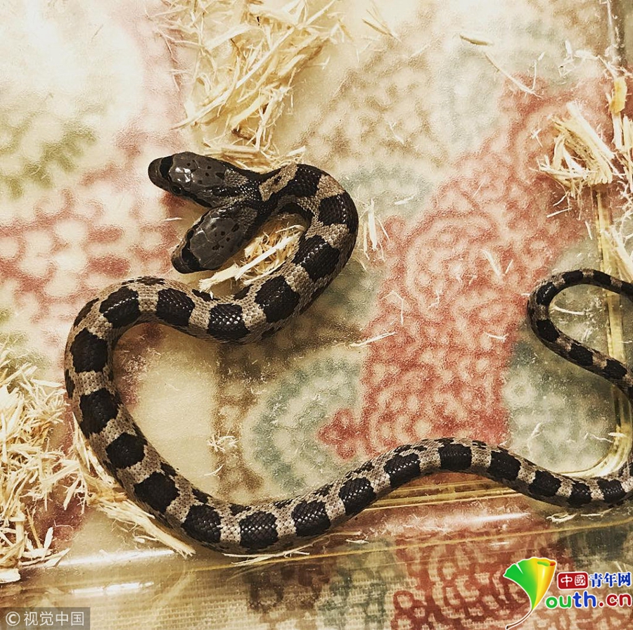 6月6日消息,在美國路易斯安那州新奧爾良,野生動物專家Tanee Janusz收養(yǎng)了同事在后院發(fā)現(xiàn)的一只雙頭錦蛇。據(jù)報(bào)道,該雙頭蛇由于基因缺陷而擁有兩只頭,概率僅有萬分之一,Tanee Janusz為兩只蛇頭分別起了名字,這對“雙胞胎”擁有不同的性格,經(jīng)常因?yàn)橥淖吲ぷ饕粓F(tuán)。 圖片來源:視覺中國