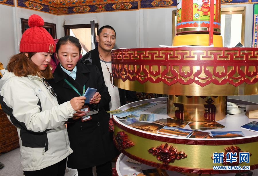 7月24日,天上西藏郵局營業員措姆(中)為游客介紹特色明信片。