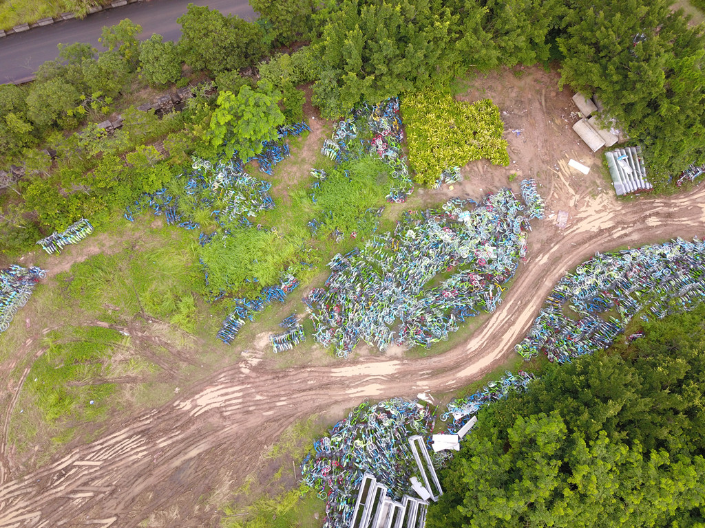 從高空俯瞰,安托山山頂?shù)墓蚕韱诬?chē)堆積無(wú)序、且周?chē)s草叢生,猶如一片共享單車(chē)“墳場(chǎng)”