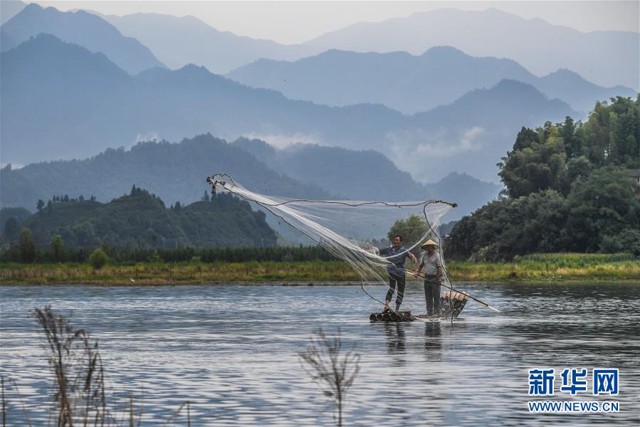 8月1日,淳安縣汾口鎮紅星村的漁民乘著竹排,在千島湖的支流武強溪上進行撒網捕撈作業。 新華社記者 徐昱 攝