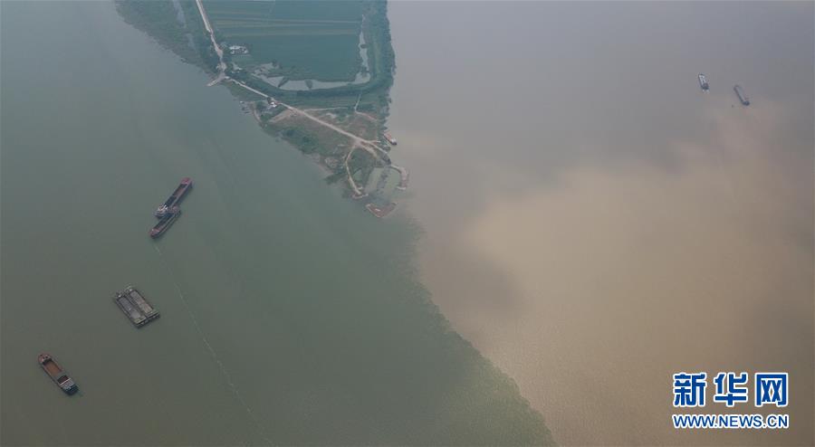 長江和鄱陽湖在江西省九江市湖口縣石鐘山附近交匯,形成江湖兩色美景(8月5日無人機拍攝)。 新華社記者 金立旺 攝