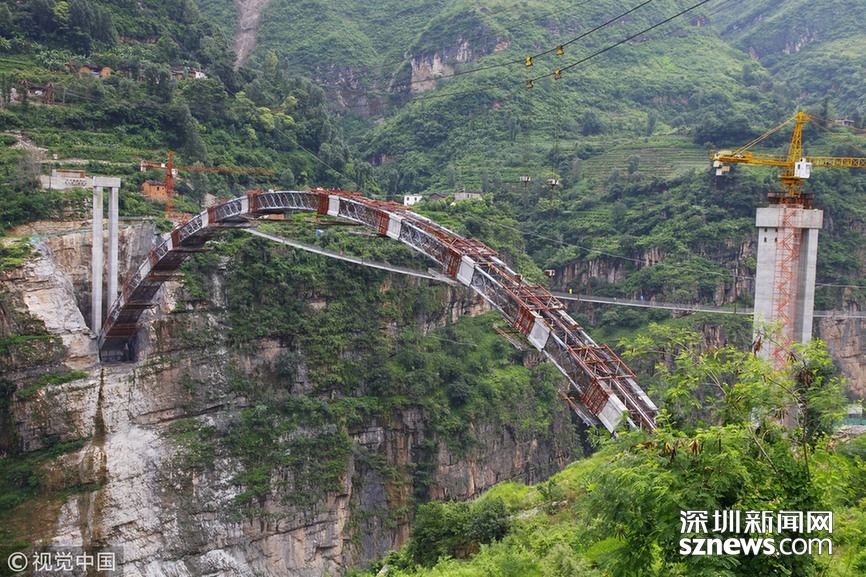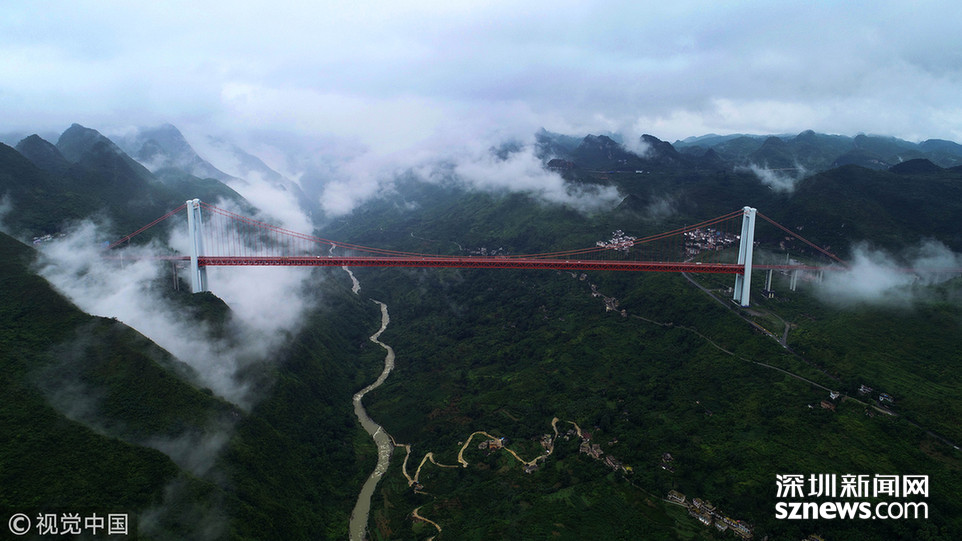 ??? 深圳新聞網訊? 畢都高速公路北盤江大橋是杭瑞高速公路畢都段的控制性工程,位于貴州省和云南省交界處,由貴州省和云南省共建。該橋橋面至江面高差達 565 米,成為目前世界第一高橋。主橋為鋼桁梁斜拉橋,主跨 720 米,目前位居同類型橋梁2016 年12 月 29 日正式通車。
