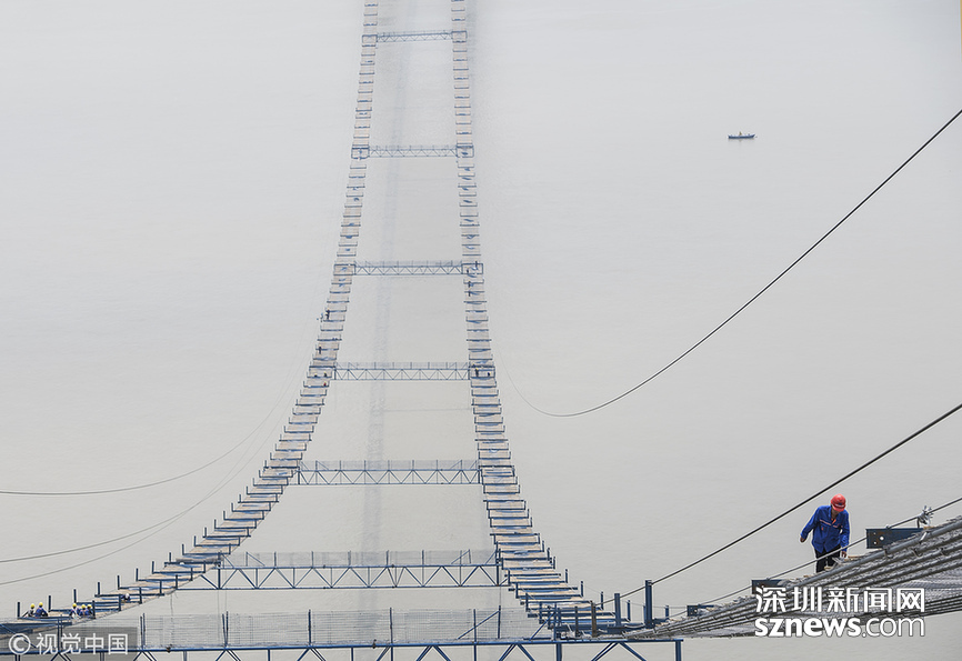 ???? 14日11時許,記者在228.8米高空建設現場感受到,高空風力在6級上下,中跨、邊跨施工便道現場一片忙碌景象:班組長雷承易帶著10余名工人或在用扳手錨緊貓道面網的扶手繩,或在鋪設鐵絲防護網……