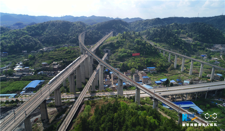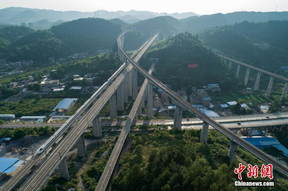 5月16日,航拍貴陽市郊交織的五條高鐵線路,一列動車駛出隧道。貴州省地處中國西南腹地,高原山地居多,因此高鐵建設的橋隧占比較高。在貴陽市烏當區新添寨,高鐵滬昆線、貴廣客運專線、貴開城際客運專線的隧道和橋梁交織在一起,形成“五洞五橋”并行。中新社記者賀俊怡 攝 5月16日,一列動車從貴陽市郊交織的橋梁上駛過。貴州省地處中國西南腹地,高原山地居多,因此高鐵建設的橋隧占比較高。在貴陽市烏當區新添寨,高鐵滬昆線、貴廣客運專線、貴開城際客運專線的隧道和橋梁交織在一起,形成“五洞五橋”并行。中新社記者賀俊怡 攝